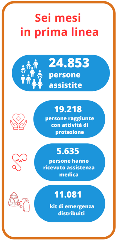 Sono stati distribuiti kit invernali per bambini e adulti rimasti senza casa per consentire loro di proteggersi dalle temperature rigide dei mesi invernali. Alle donne e alle ragazze sono stati distribuiti dignity kit contenenti prodotti necessari per l’igiene mestruale, come assorbenti e sapone, con il fine di tutelare la loro dignità durante la permanenza nei ripari di emergenza. A tutte le persone sfollate sono, inoltre, stati consegnati kit con prodotti igienici di vario tipo, necessari per garantire la loro salute e prevenire anche il collasso dei servizi sanitari locali.